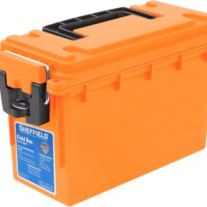 Sheffield 12630 Ammo Storage Box, Stackable .30 Cal Field Boxes, Water and Dust Resistant, Lockable Storage Box with Handle, Secures Hunting Gear, Supplies, and Bullets, Made in USA, Orange, 1-Pack