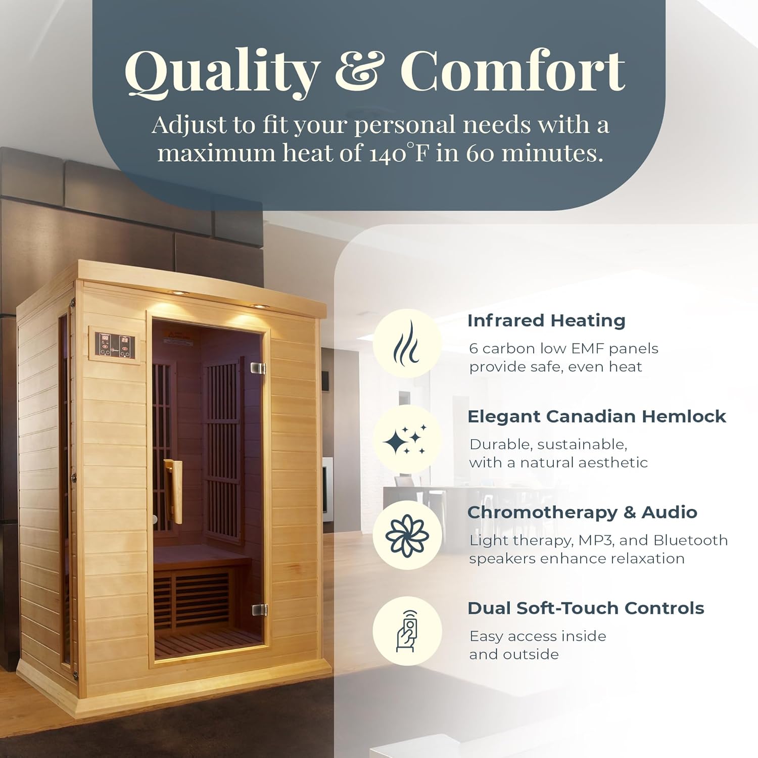 Dynamic San Marino 2-Person Low EMF FAR Infrared Sauna – Canadian Hemlock Wood | 6 Carbon Heating Panels | Bluetooth Music System with Speakers | Interior Reading & Chromotherapy Lighting | Curbside Delivery