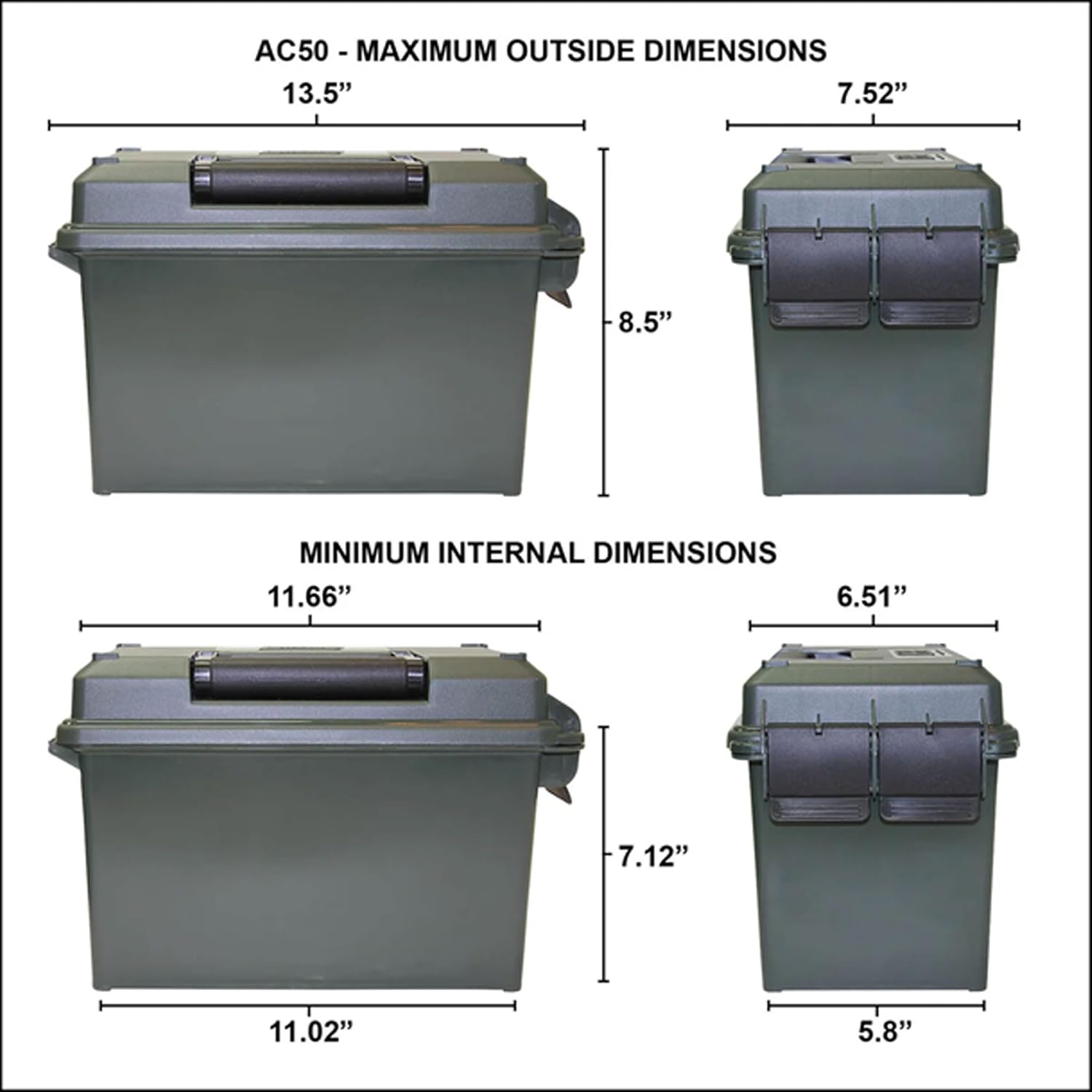 Description MTM ammo cans are a great way to store bulk or boxed ammo. Its all plastic design is lighter in weight than the 50 caliber US Military Surplus Ammo Can. Transferring ammo to and from the range, just became a little easier! Ideal for ammo storage. Molded out of rugged polypropylene plastic, these comfortably handled ammo cans will hold up to some pretty harsh treatment. Utilizing MTM’s tongue and groove O-Ring seal system for a superior water-resistant seal, the 50 cal can is designed to fit the same amount of bulk ammo storage as the original. A heavy-duty dual latching system makes for a better seal and less likely to open accidentally. Double padlock tabs along with molded-in stacking ridges, make these solid containers the perfect solution to so many storage needs. Inside Dim: 5.8”(L) x 11.0”(W) x 7.2”(H) Outside Dim: 7.4”(L) x 13.5”(W) x 8.5”(H)