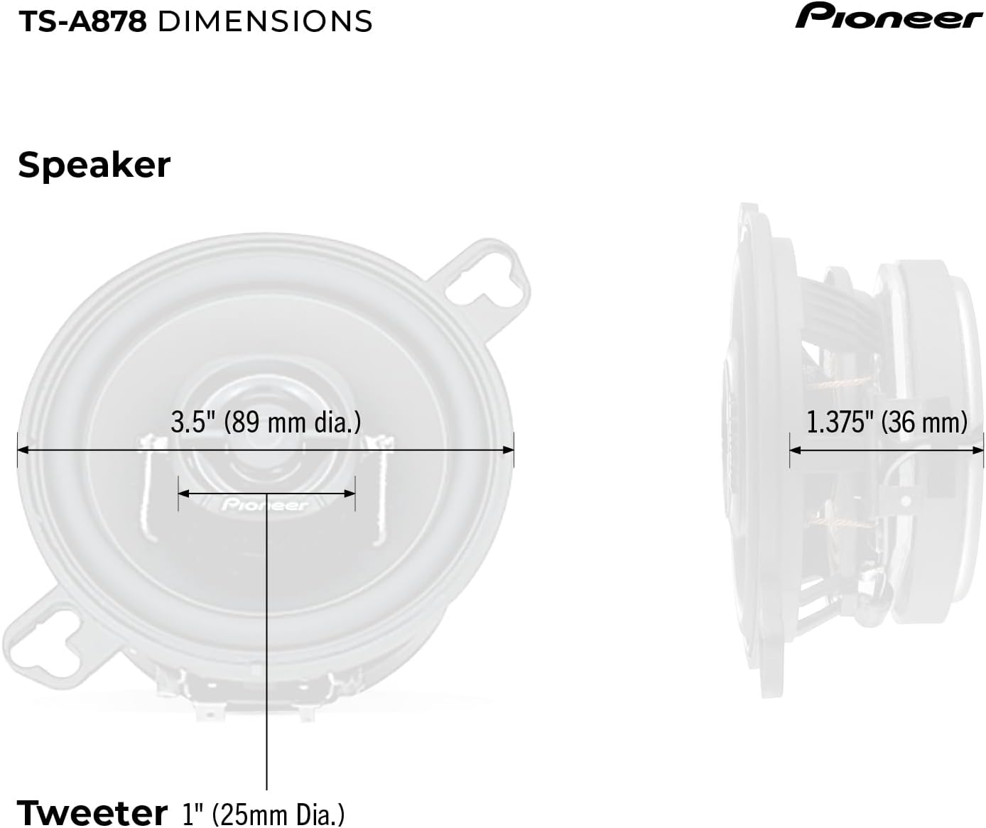 Upgrade your car audio system with the Pioneer TS-A878 2-Way Coaxial Car Speakers. These 3-1/2″ round speakers deliver premium audio performance, enhancing audio details and improving acoustic clarity for a truly immersive listening experience. Featuring a 2-way design with separate drivers for different frequency ranges, they provide accurate, balanced sound reproduction. With a peak power handling of 60 watts and continuous handling of 15 watts, these small speakers deliver dynamic, clear, and precise audio at any volume. Their broad frequency response of 60 Hz to 28 kHz ensures rich sound reproduction across a variety of music genres. The enhanced sound clarity comes from a 25mm tweeter for crisp highs, paired with a 3.5″ carbon and graphite reinforced IMPP cone for reduced distortion and increased rigidity. Designed for compatibility with various vehicle systems, the TS-A878 speakers make an excellent replacement for factory-installed speakers or a simple upgrade for existing setups. Professional installation is recommended, though they can be installed DIY with proper vehicle and electrical knowledge. Upgrade your car’s audio system today and experience the renowned sound quality of Pioneer.