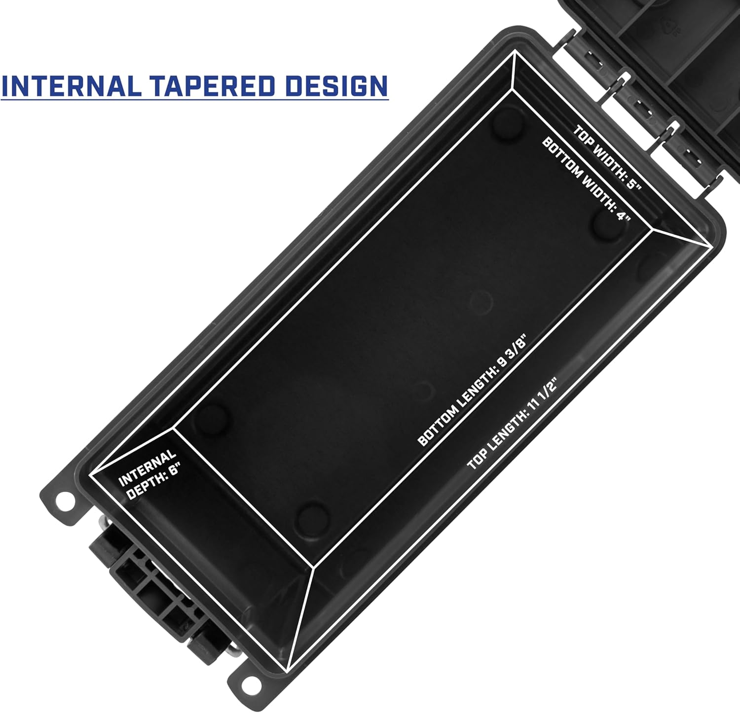 The box includes a secure locking point for enhanced safety, a heavy-duty carry handle for easy transport, and a stackable design that helps maximize storage space.