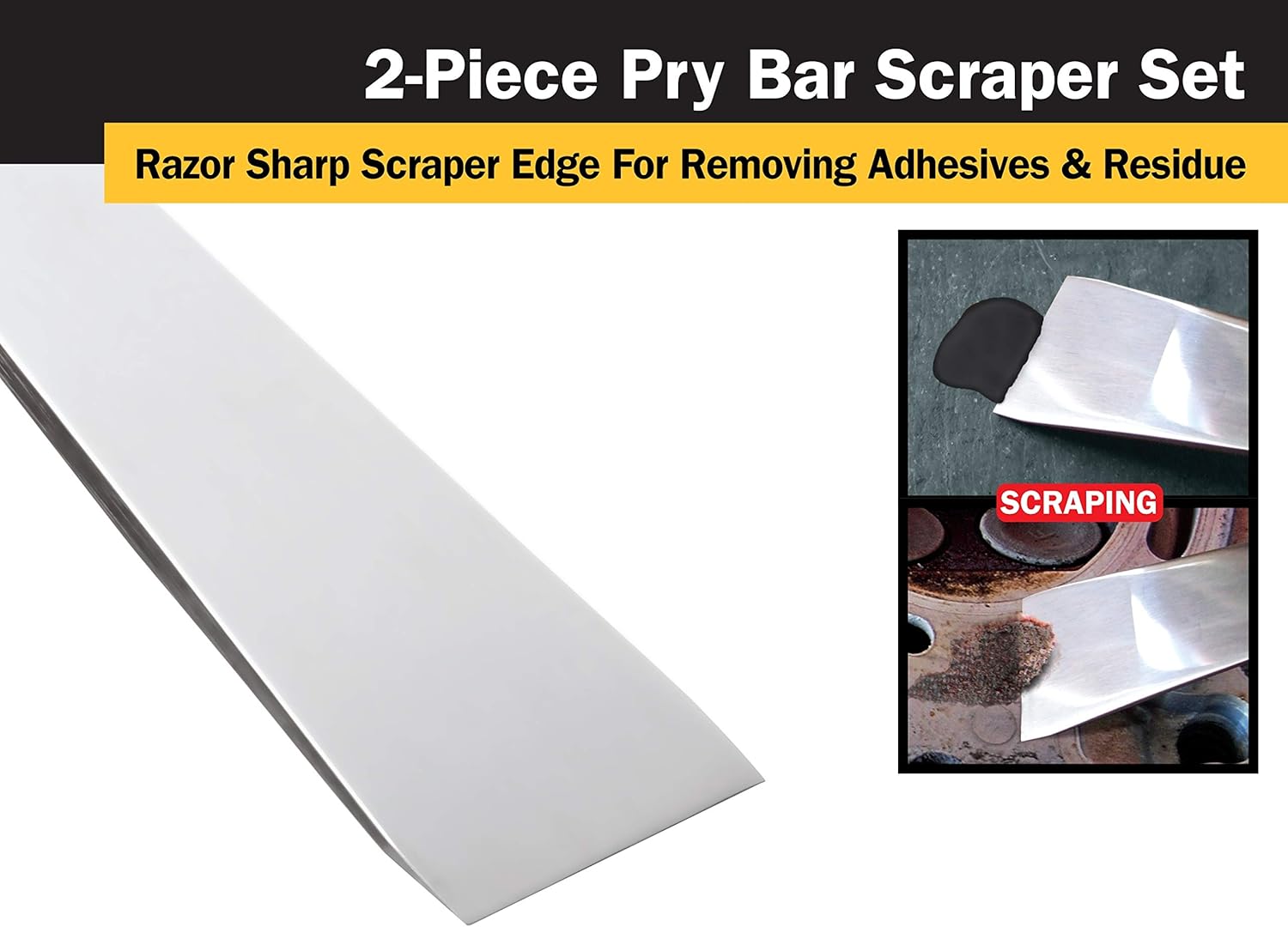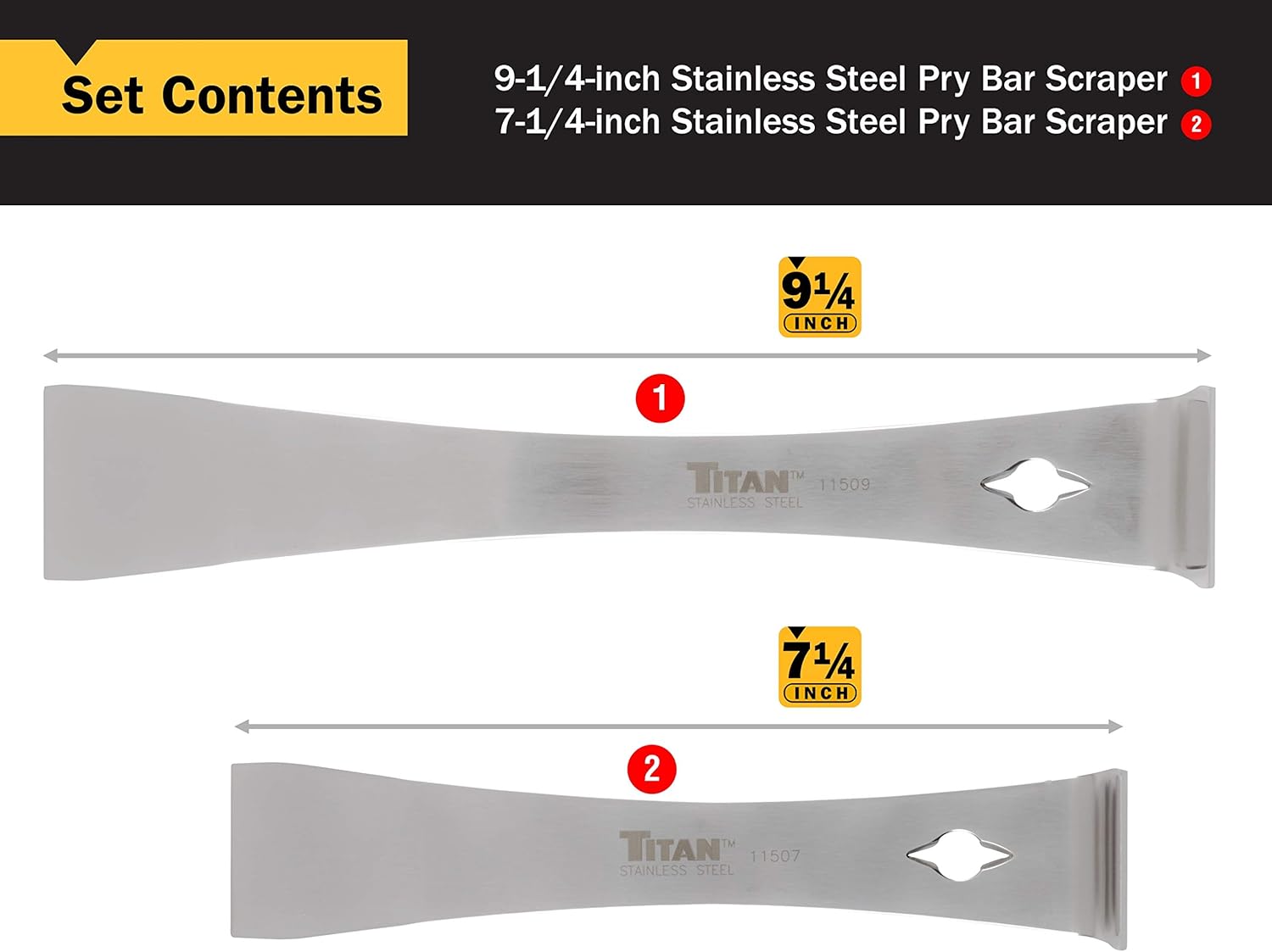 - Set Contents: (1) 7-1/4″ and (1) 9-1/4″ Stainless Steel Pry Bar Scraper
